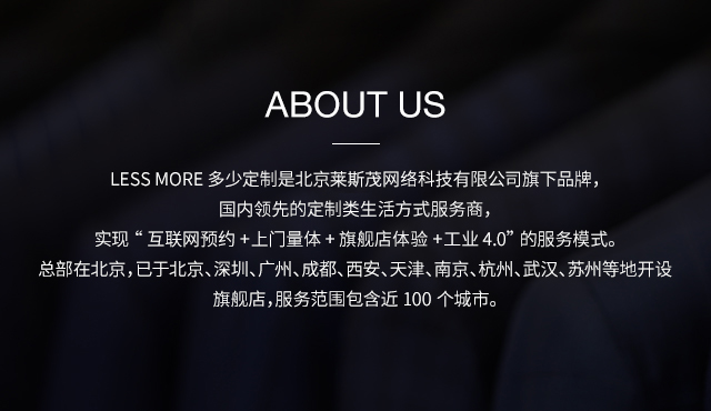 LESS MORE多少定制 2015年5月創立于北京,以互聯網思維和工業4.0切入服裝定制領域,獨創“互聯網預約+旗艦店體驗+免費上門量體+工業4.0 C2M生產”的模式,現已成為國內服裝定制行業的標桿品牌。